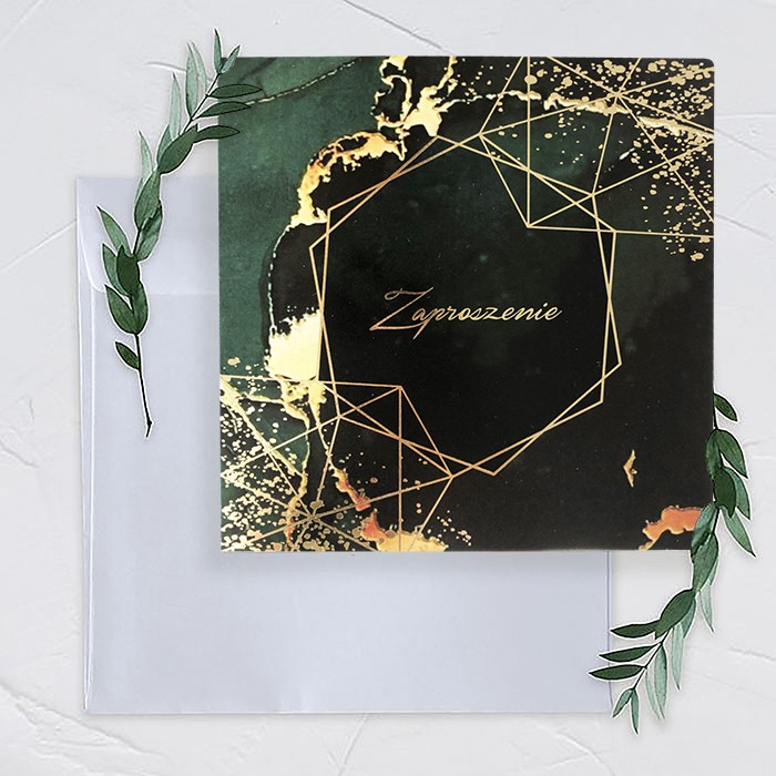 Eleganckie zaproszenie ślubne z kolekcji limitowanej, utrzymane w modnej, ciemnej kolorystyce z artystycznym motywem przypominającym marmur, przełamanym geometrycznym wzorem i złoceniem wykonanym metodą hotstampingu. Złoty ornament oraz napis "Zaproszenie" subtelnie błyszczą na tle nasyconej zieleni i czerni, tworząc wyjątkowy efekt wizualny.