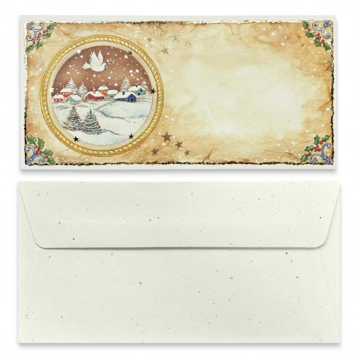 Kartka świąteczna z kopertą, wykonana z wysokiej jakości ozdobnego papieru, z precyzyjnie nadrukowaną grafiką świąteczną i uszlachetnieniem, łączy w sobie prostotę i elegancję. Idealna do samodzielnego wypisania życzeń lub nadruku we własnym zakresie.