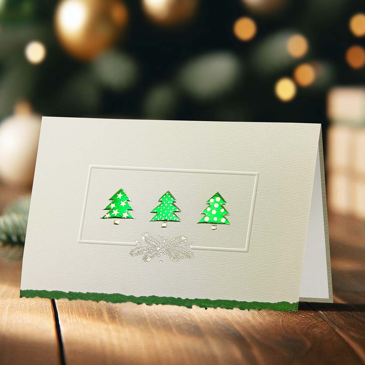 Karta świąteczna z wysokiej jakości ozdobnego papieru delikatnie fakturowanego z klasycznym motywem trzech choinek w tłoczonej ramce. Karty wykonane z ogromną starannością i dbałością o detale. Precyzyjny nadruk, dokładność wykonania oraz wysokiej jakości papier.