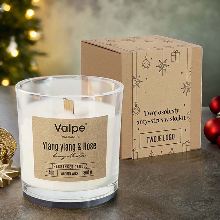 Subtelne nuty ylang-ylang i róży tworzą aromat pełen elegancji i harmonii, który koi zmysły i wprowadza romantyczny nastrój. Drewniany knot podczas palenia wydaje delikatne trzaski, przywodząc na myśl ciepło domowego ogniska. Transparentne, błyszczące szkło podkreśla klasyczny charakter świecy, czyniąc z niej produkt premium - idealny na biznesowy prezent.