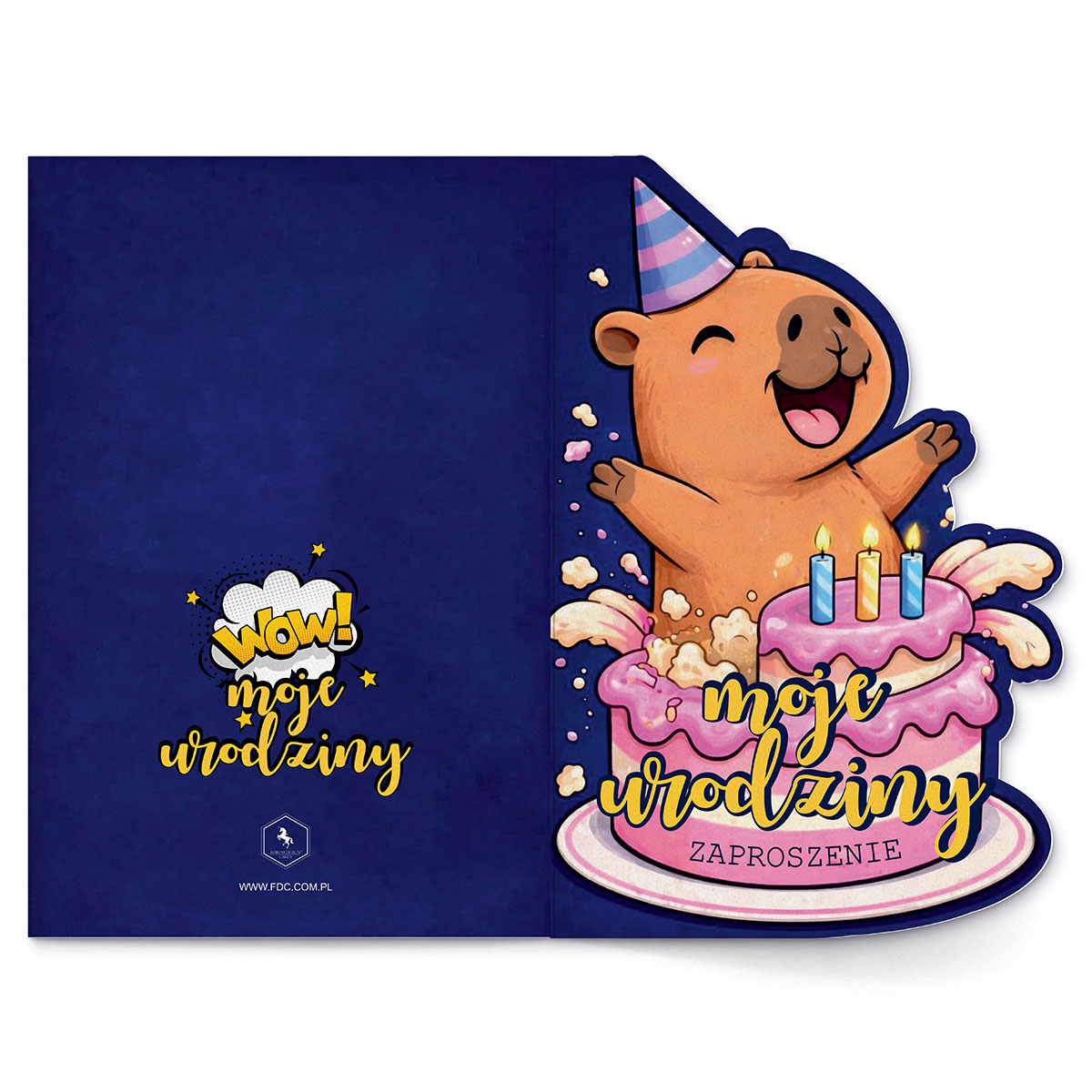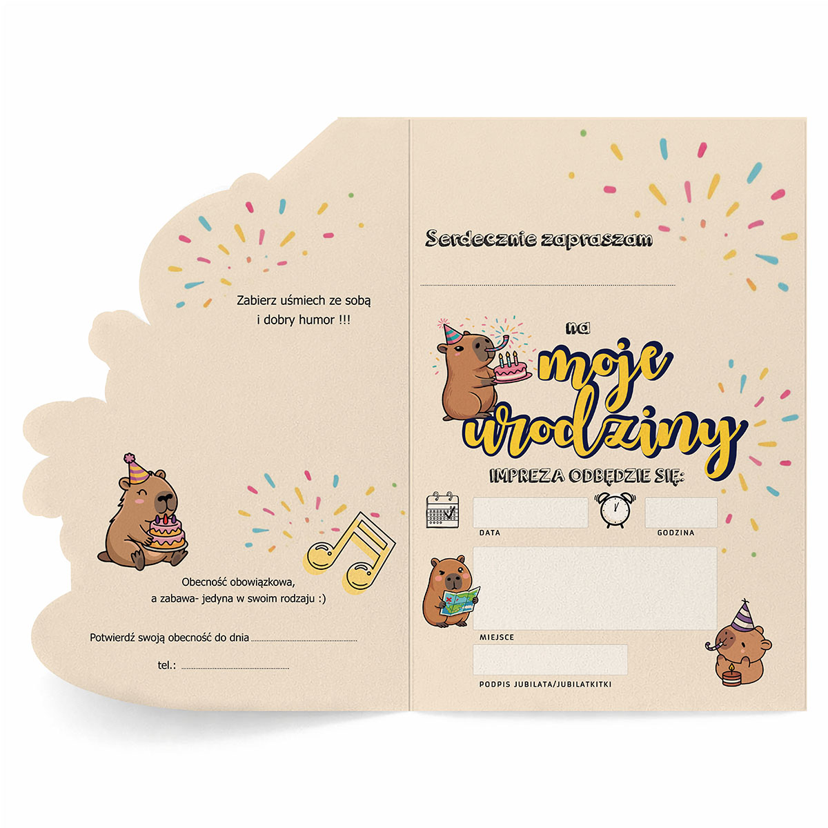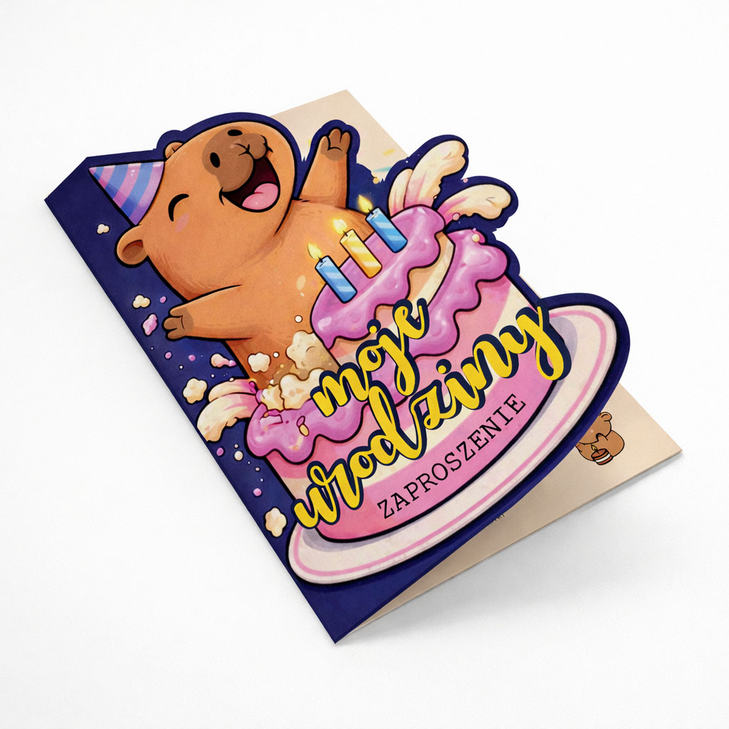 Jeśli chcesz zaproszenia, które od razu budują klimat urodzin i wywołują uśmiech jeszcze przed imprezą - ta kapibara wie, jak to zrobić.