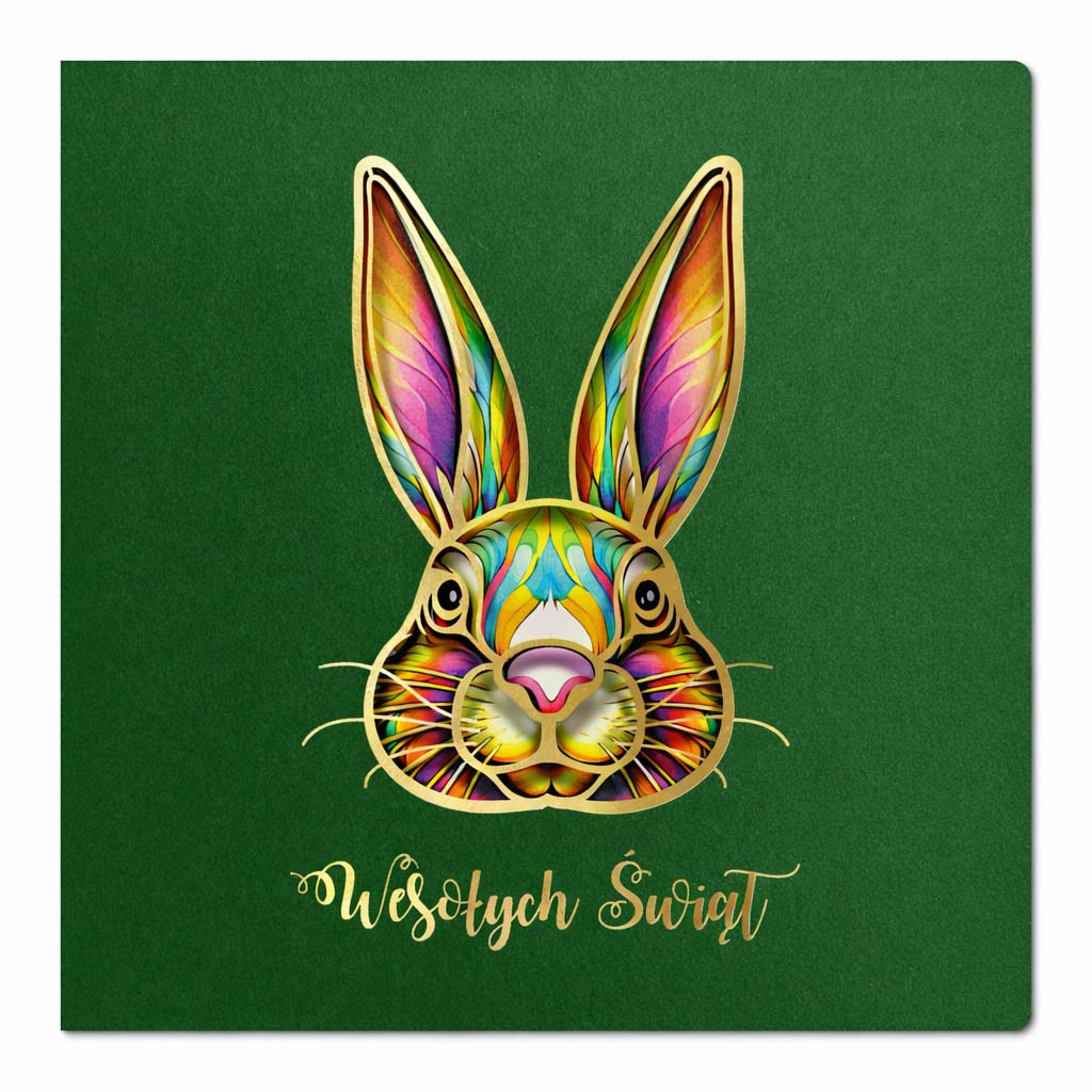Centralnym motywem jest zając wielkanocny opracowany w formie wielobarwnej, dekoracyjnej ilustracji o dynamicznym charakterze. Połączenie intensywnych kolorów z dopracowanymi detalami graficznymi tworzy efekt nowoczesnej interpretacji symboliki wielkanocnej - kojarzonej z odrodzeniem, energią i nowym początkiem. Kompozycja przyciąga uwagę, a jednocześnie pozostaje estetyczna i spójna.