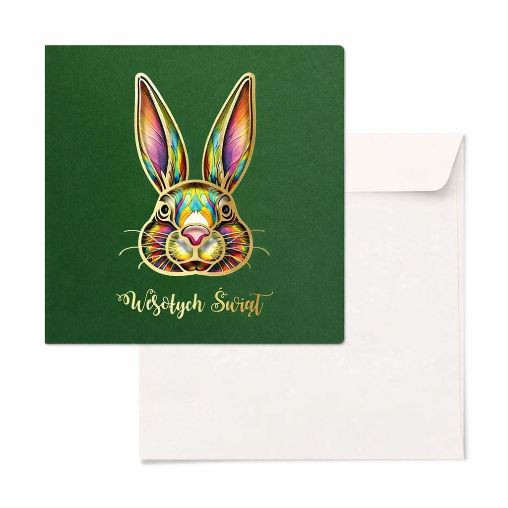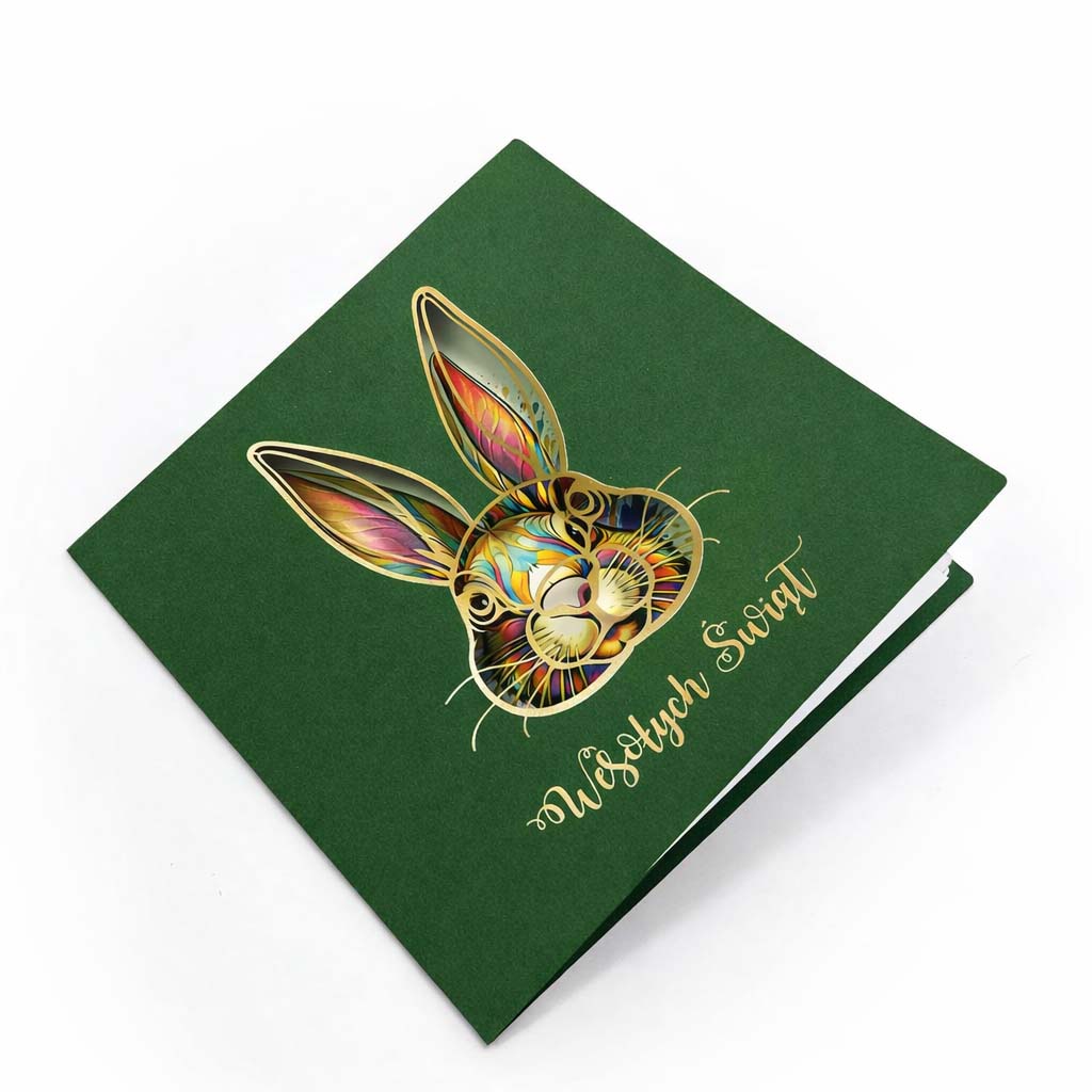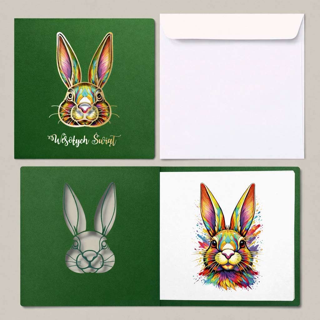 Kartki wielkanocne wchodzące w skład zestawu wyróżniają się nowoczesnym, artystycznym charakterem, zachowując jednocześnie elegancję i estetyczną równowagę. Głębokie, zielone tło okładki stanowi szlachetną bazę dla wyrazistej ilustracji, nadając całości świeży, współczesny wygląd.