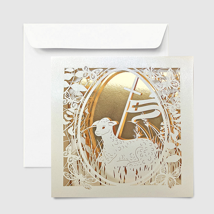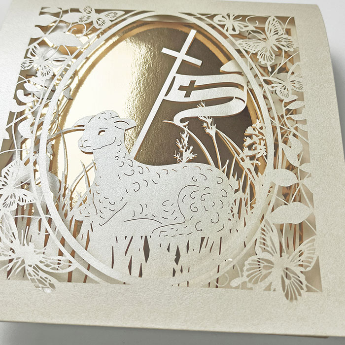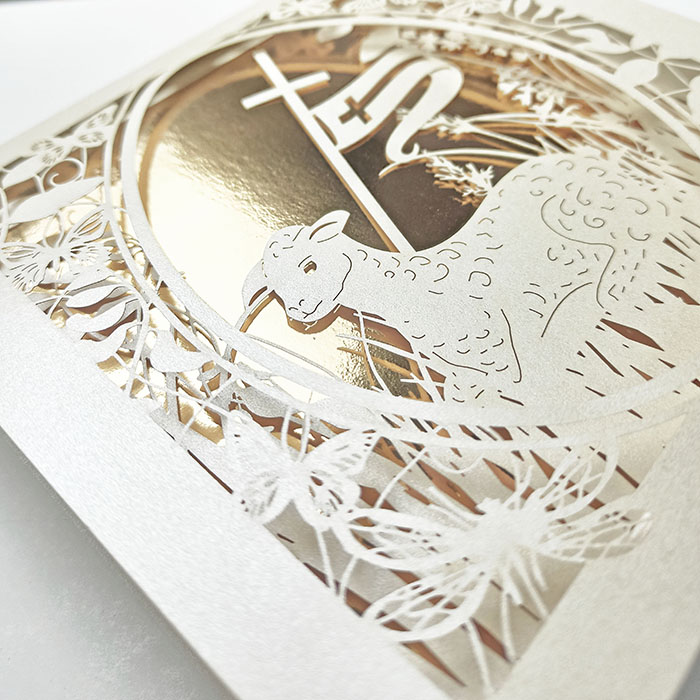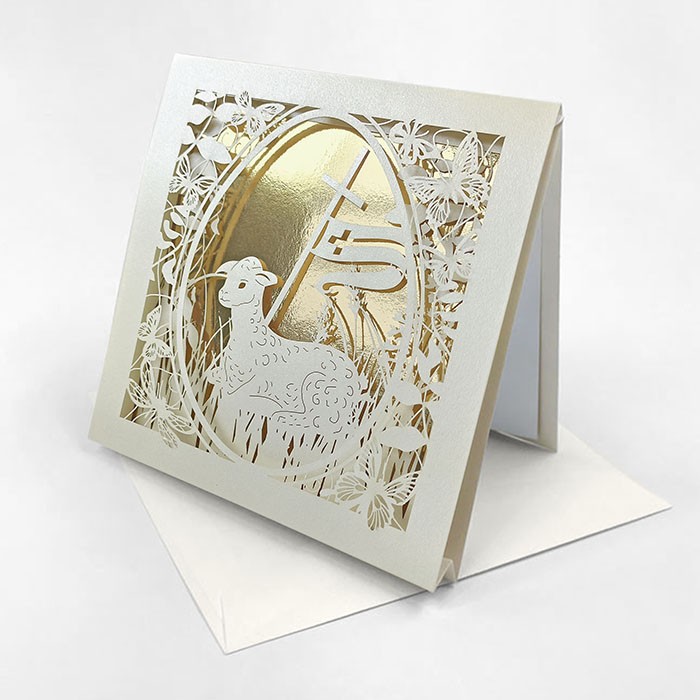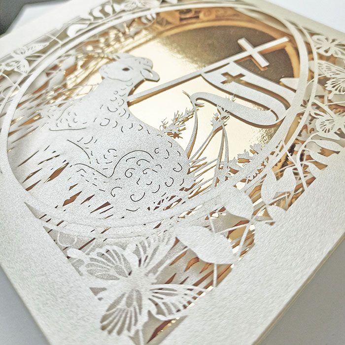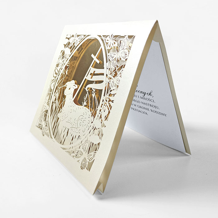 Centralnym elementem kompozycji jest misternie wycięty laserowo motyw wielkanocnego baranka, otoczonego delikatnymi kwiatami i motylami. Przez ażurowe wycięcie widoczna jest złocona wkładka, pełniąca rolę dekoracyjnego tła i budująca efekt głębi oraz eleganckiej przestrzenności. Połączenie precyzyjnego cięcia laserowego z luksusowym złoceniem podkreśla religijny i uroczysty charakter kartki.