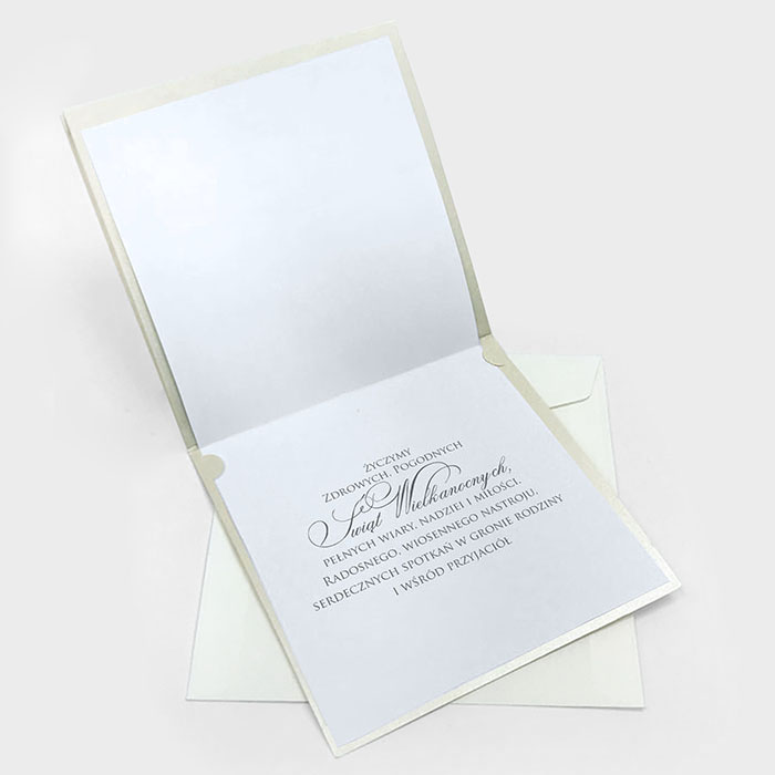 Kartki wielkanocne wchodzące w skład zestawu wyróżniają się elegancką, ażurową formą oraz szlachetną kolorystyką. Okładka została wykonana z wysokiej jakości metalizowanego papieru w kolorze ecru, który nadaje całości subtelnego blasku i wyrafinowanego charakteru.