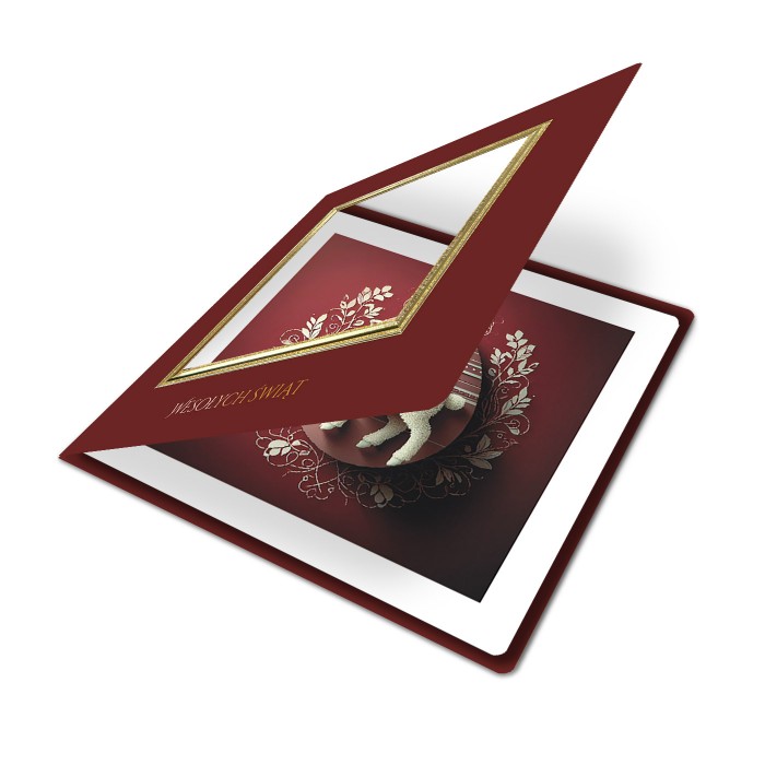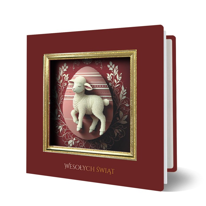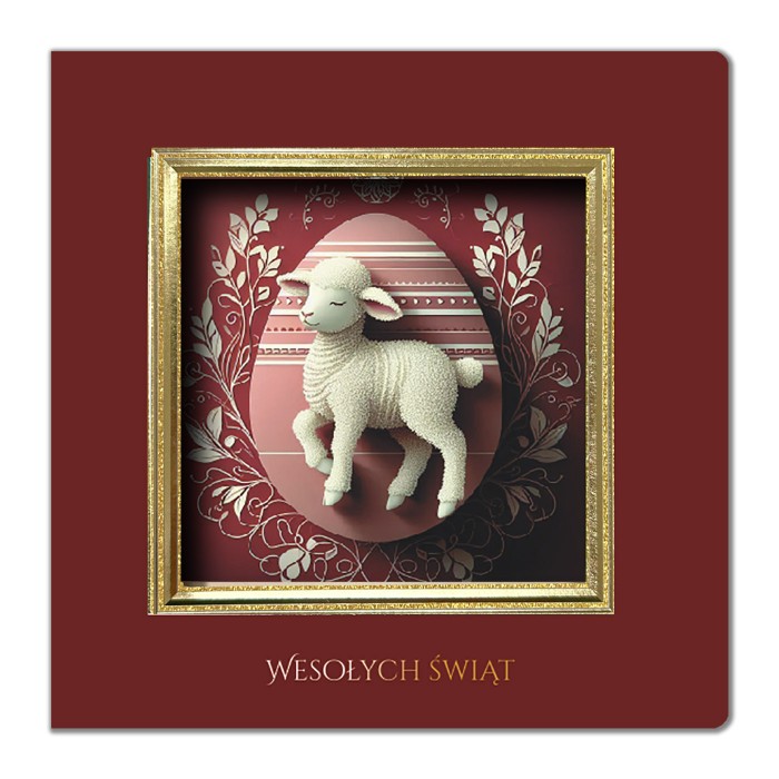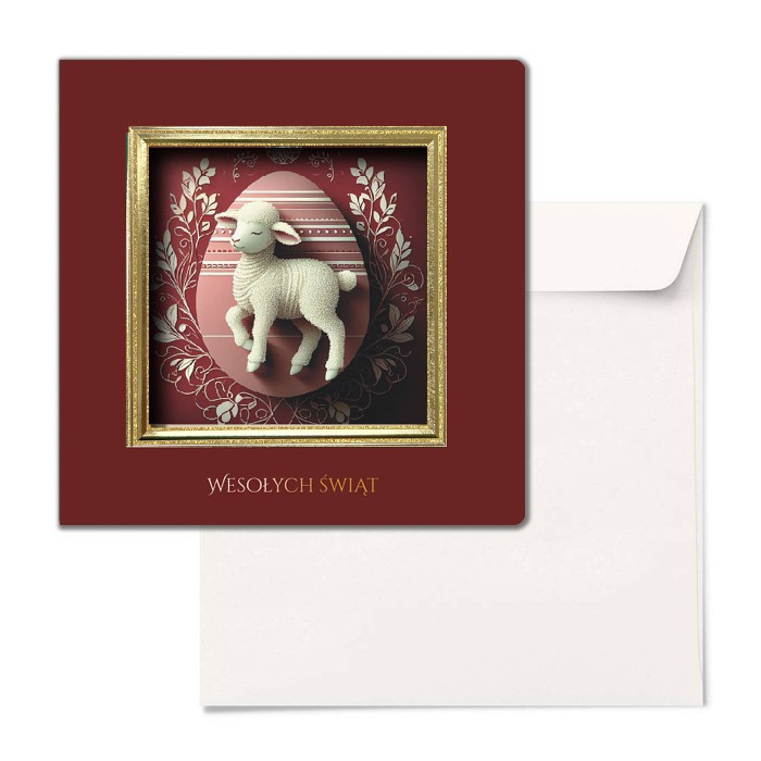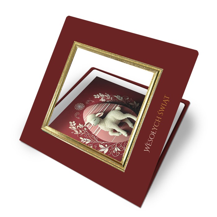 Centralnym elementem projektu jest złocona, tłoczona trójwymiarowa ramka z dekoracyjnym oknem, przez które widoczna jest nadrukowana świąteczna grafika z motywem baranka. Symbolika religijna została przedstawiona w spokojnej, dostojnej formie, podkreślającej podniosły charakter Świąt Wielkanocnych. Całość dopełnia złocony napis "Wesołych Świąt", nadający kartce uroczysty i reprezentacyjny ton.