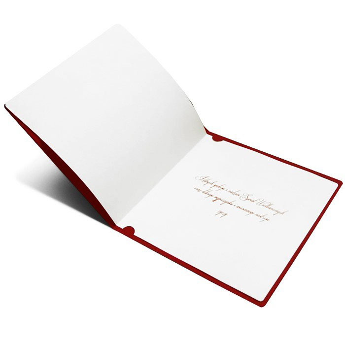 Wnętrze kartki uzupełnia matowa wkładka w kolorze ecru, spójna stylistycznie z bordową okładką i złoceniami, odpowiednia zarówno do korespondencji prywatnej, jak i oficjalnej.