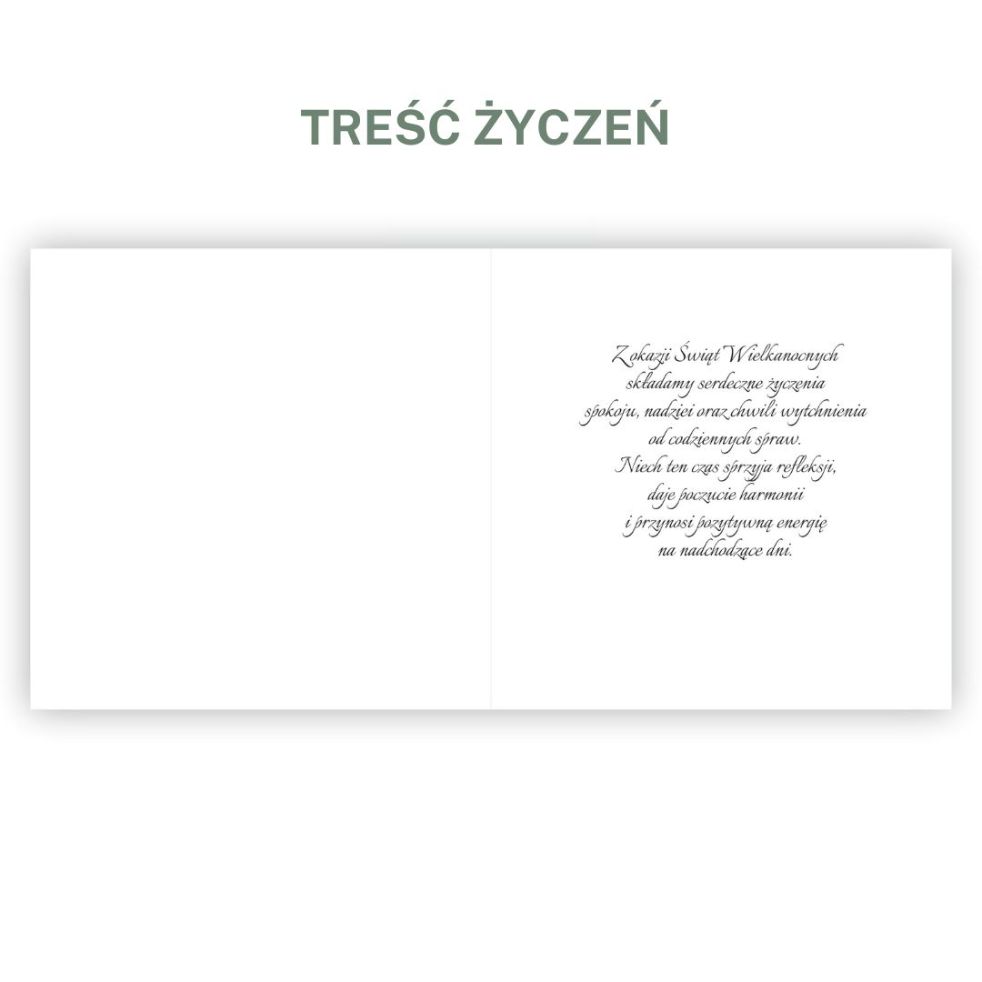 Kartki zawierają nadrukowane, uniwersalne życzenia wielkanocne oraz dodatkowe puste wkładki, dzięki czemu można wręczyć je od razu lub dodać kilka osobistych słów czy indywidualny wydruk.