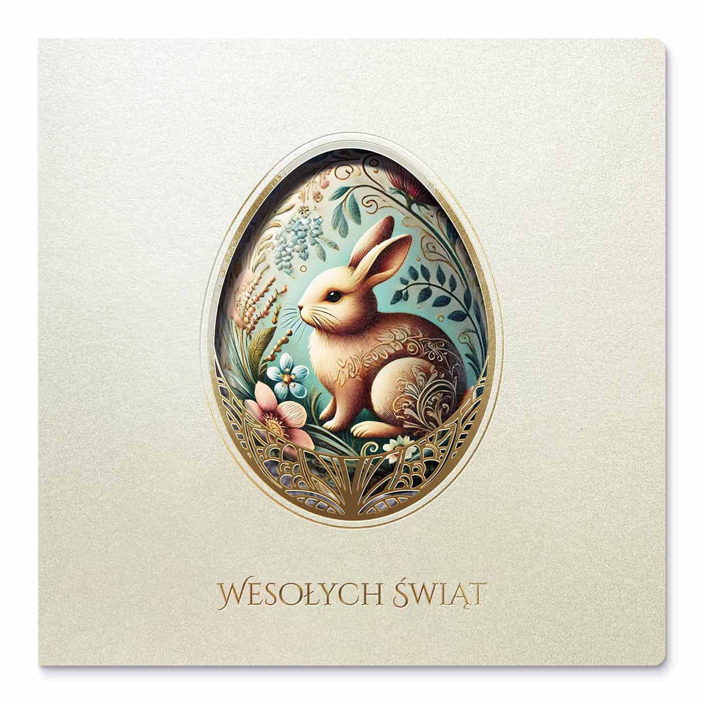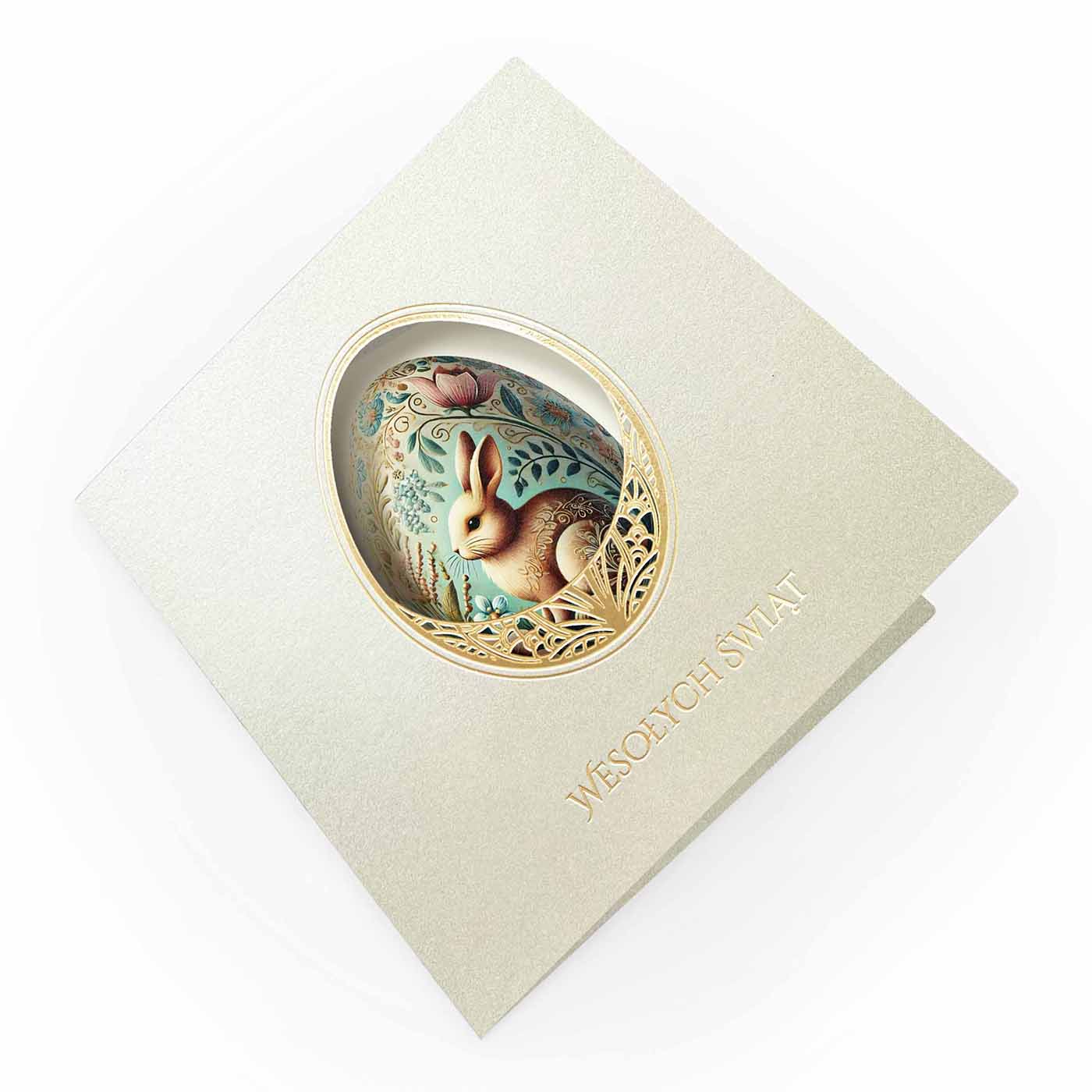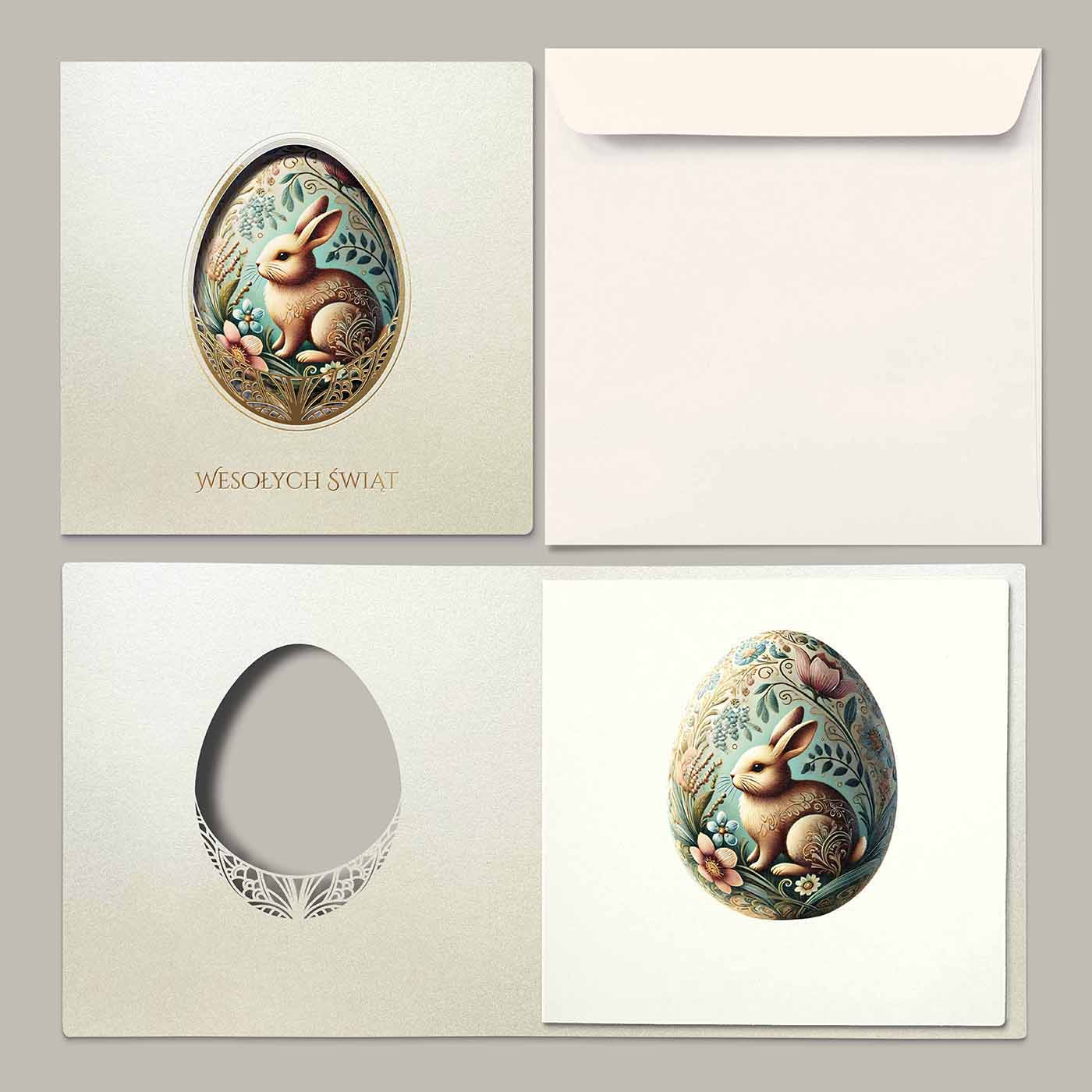 Subtelne i niezwykle eleganckie kartki wielkanocne wyróżniają się misternie wycinanym laserowo motywem dekoracyjnej pisanki, w której centralnym punkcie znajduje się delikatna ilustracja zajączka w otoczeniu wiosennych roślin. Opalowe tło w połączeniu ze złotymi akcentami tworzy harmonijną, spokojną kompozycję, idealnie wpisującą się w klasyczny charakter Świąt Wielkanocnych.