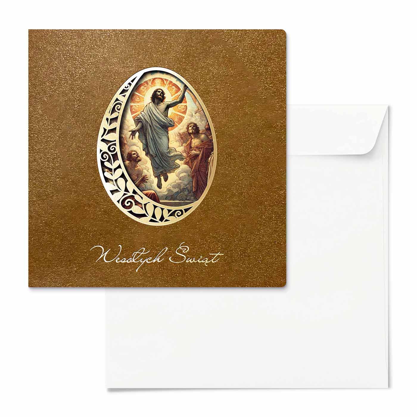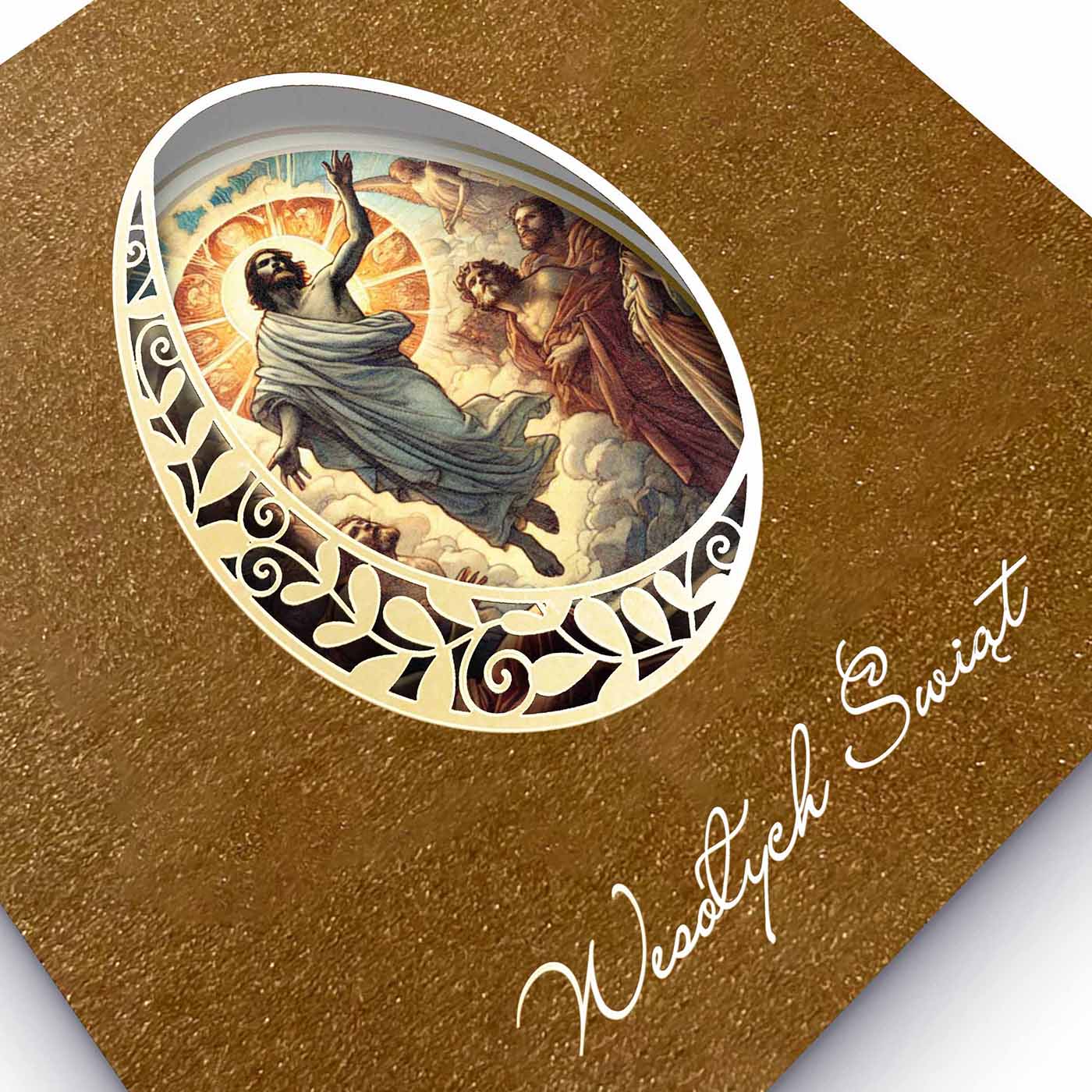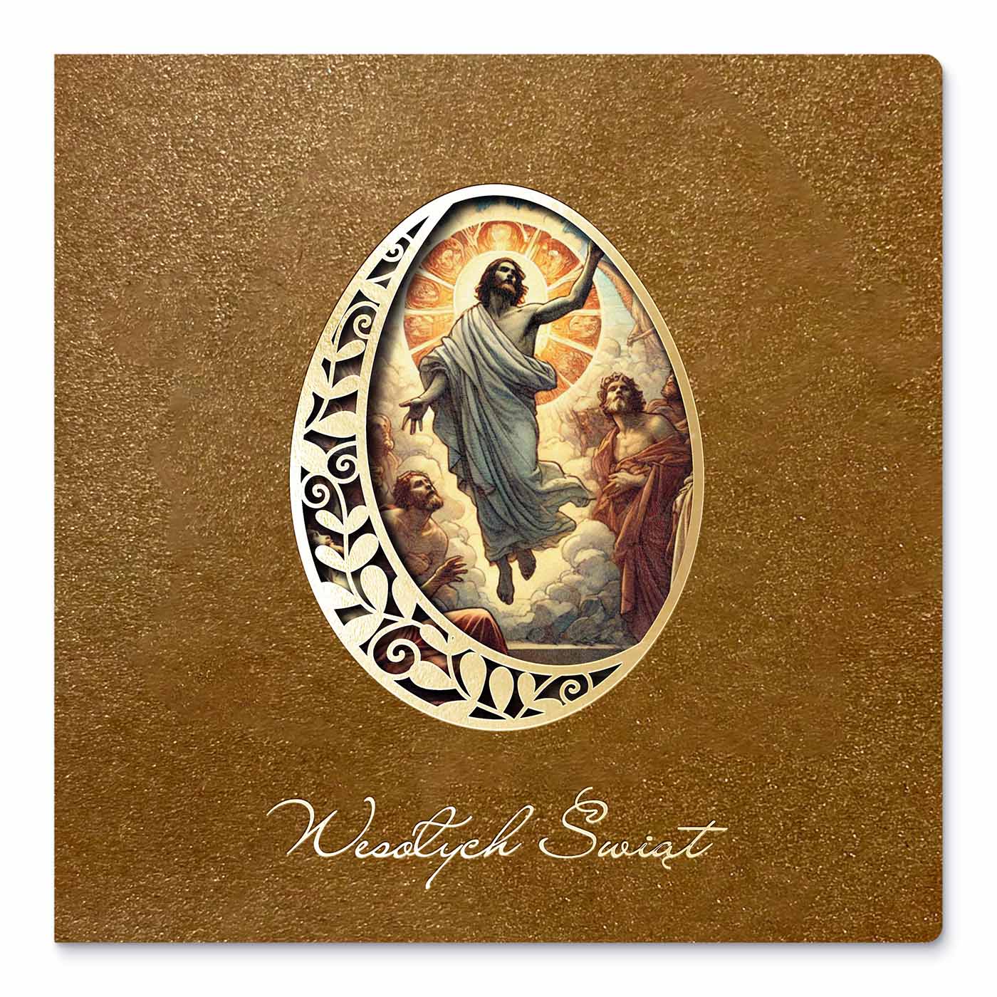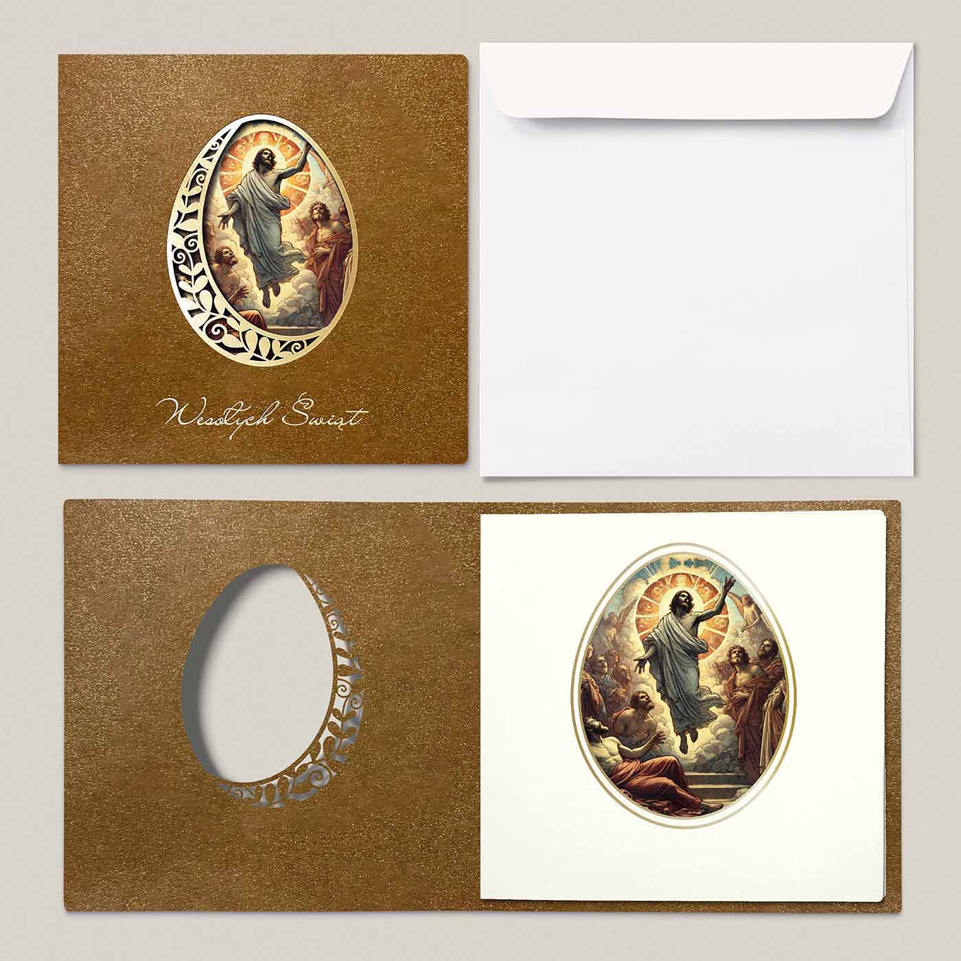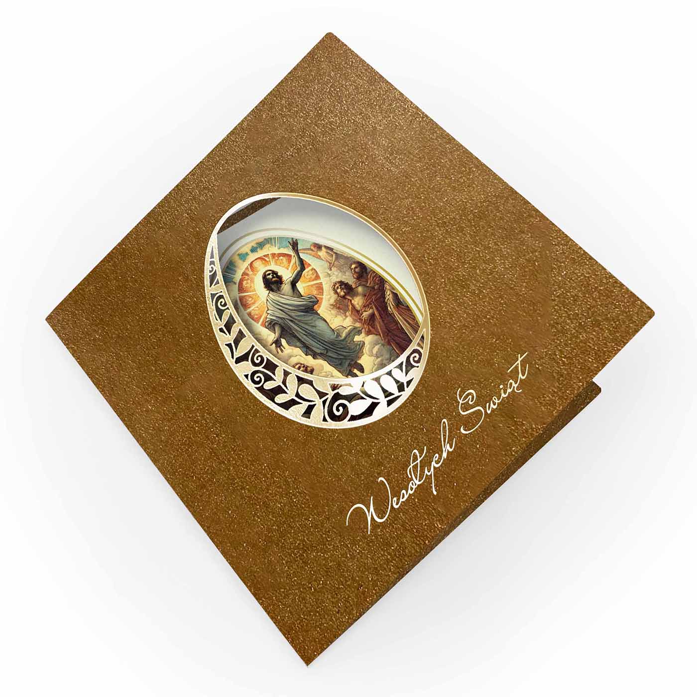 Centralnym elementem każdej kartki jest dekoracyjne jajko z ażurowym wycięciem laserowym oraz subtelnym złoceniem. Przez precyzyjnie wycięty ornament widoczna jest elegancka, religijna grafika umieszczona na wkładce, co tworzy efekt głębi i wyjątkowej lekkości kompozycji. Całość dopełnia delikatny napis "Wesołych Świąt", harmonijnie wpisujący się w projekt.