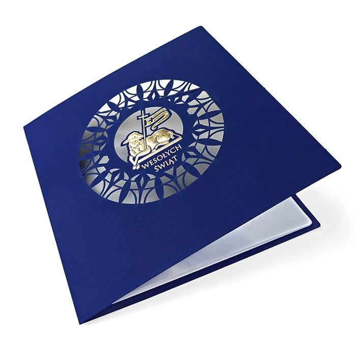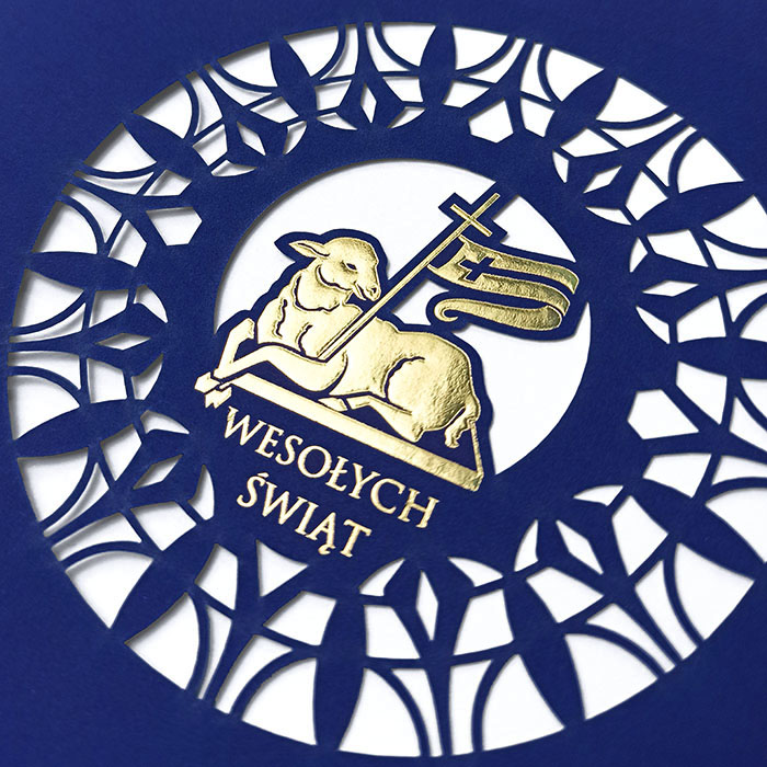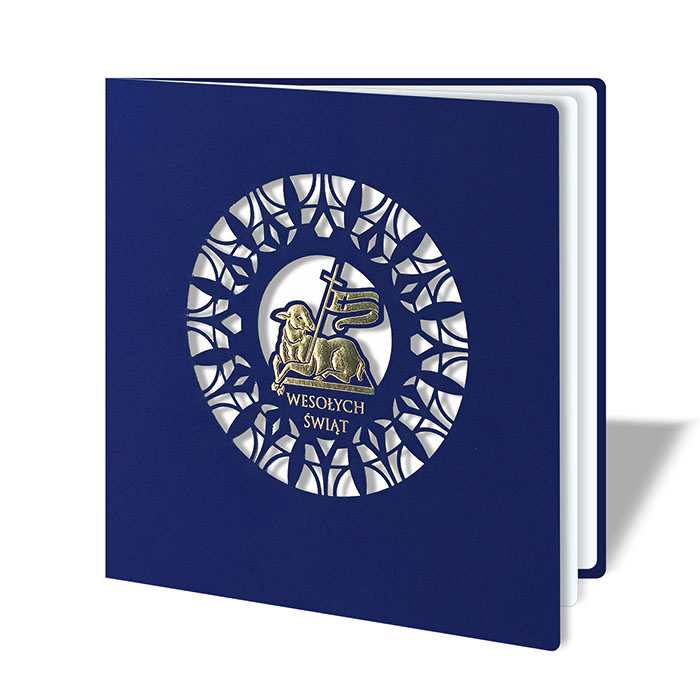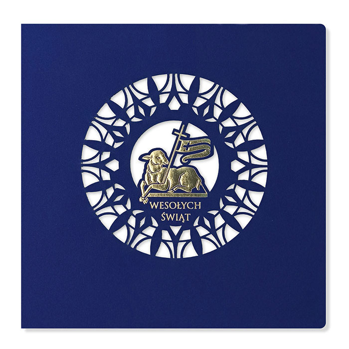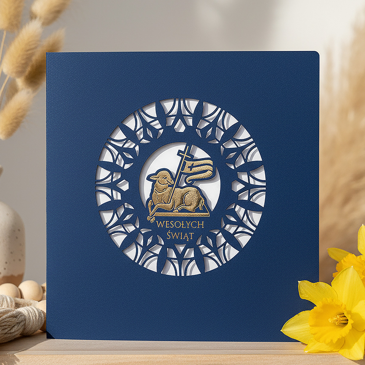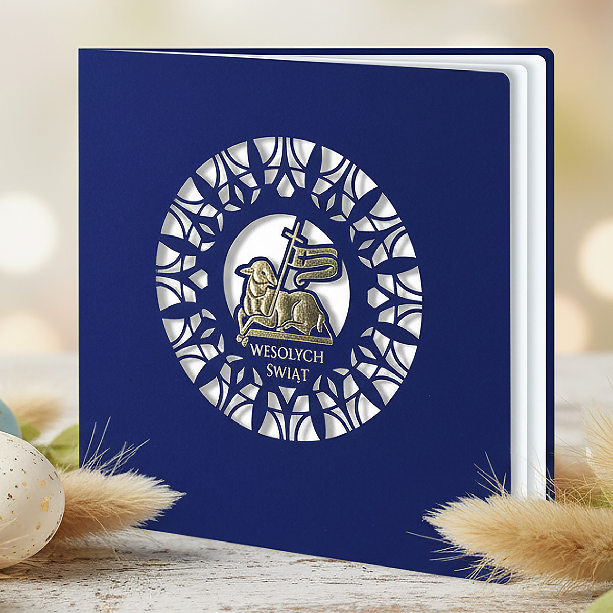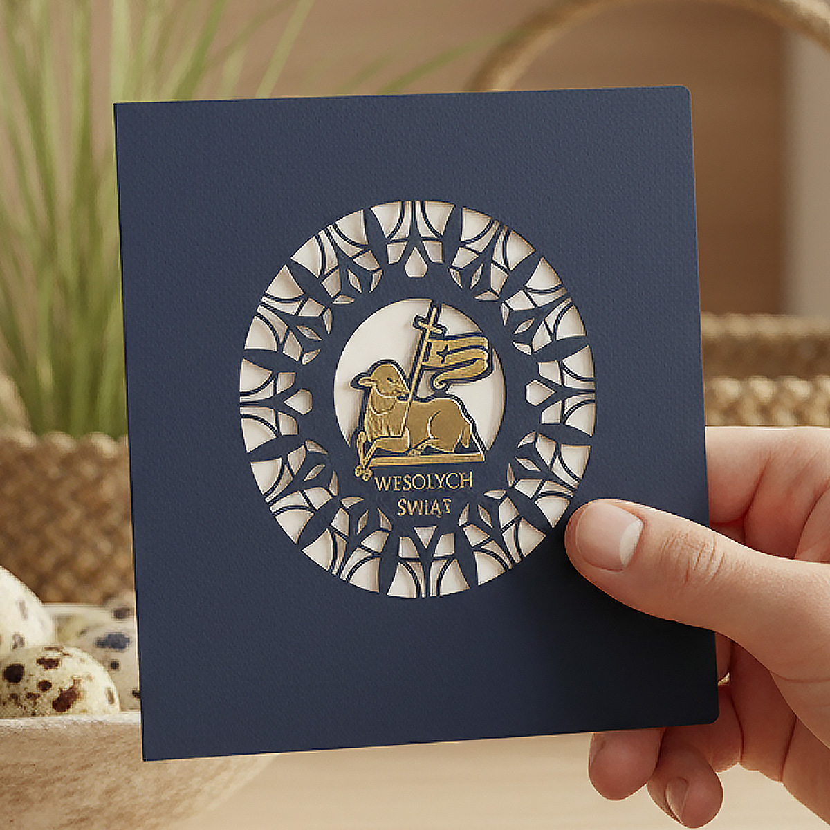 Centralnym motywem każdej kartki jest trójwymiarowy wizerunek Baranka Wielkanocnego, wykonany techniką złocenia i precyzyjnego cięcia laserowego. Motyw umieszczony został wewnątrz ażurowego, okrągłego ornamentu, który tworzy efekt głębi i lekkości, podkreślając prestiżowy charakter całego zestawu.