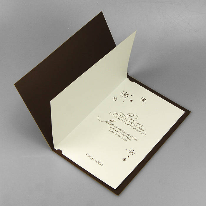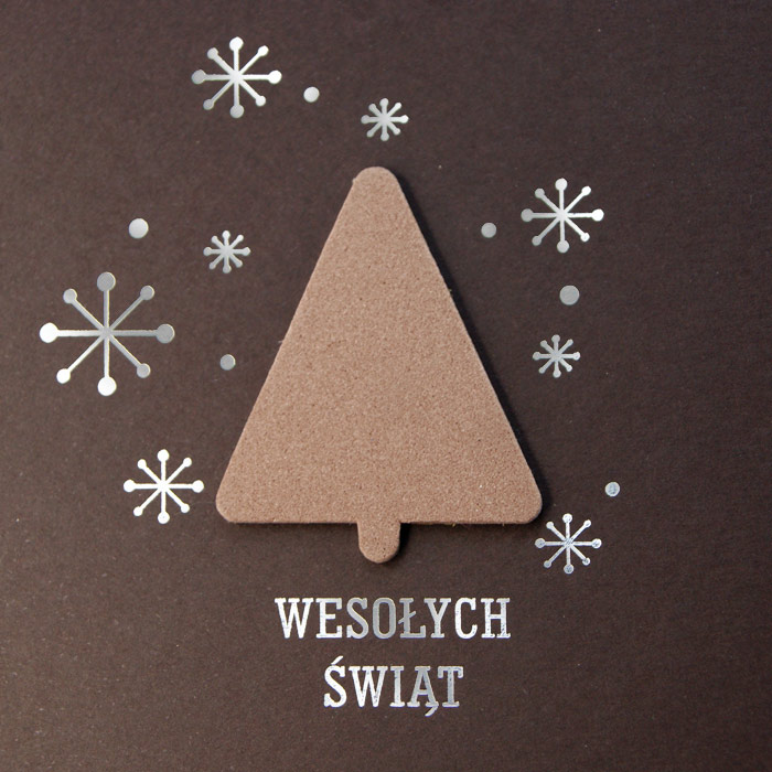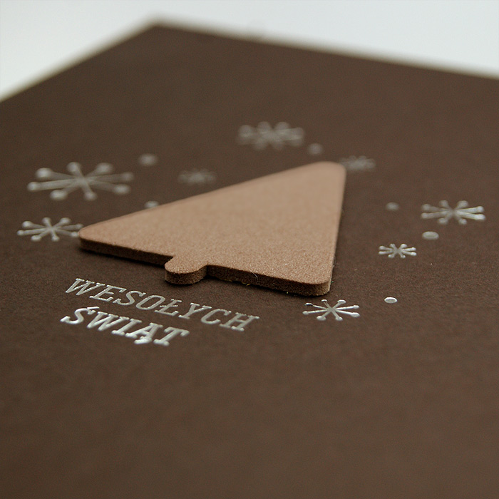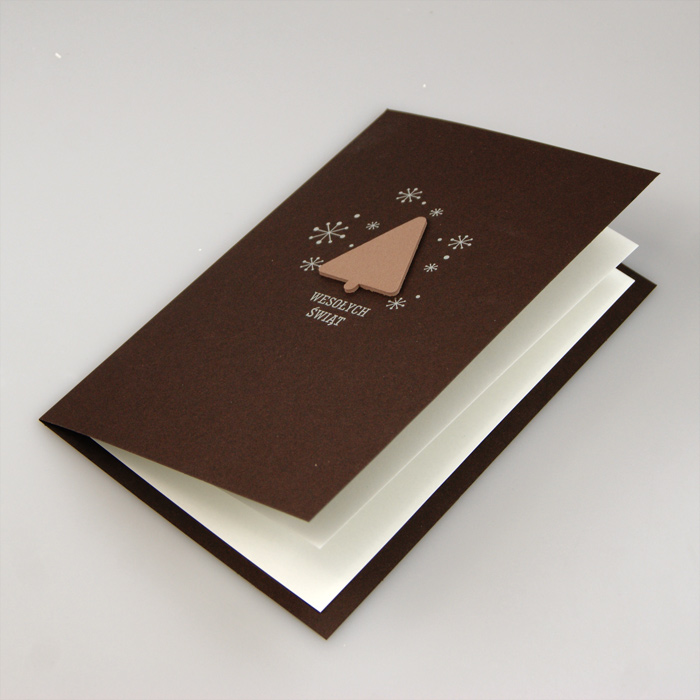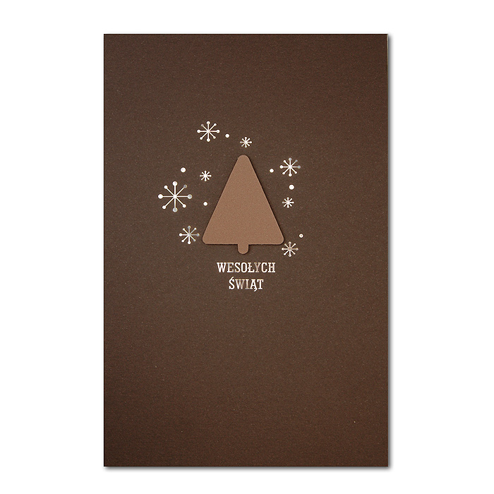 Wyjątkowa kartka świąteczna, wykonana z wysokiej jakości ozdobnego, matowego papieru w kolorze brązowym. W centralnej części znajduje się aplikacja w kształcie choinki, wykonana z miłej w dotyku pianki. Okładkę ozdabia napis "Wesołych Świąt" oraz delikatny motyw śnieżynek wykonanych srebrną folią. Wkładka do nadruku tekstu ecru matowa. Karty wykonane z ogromną starannością i dbałością o detale. Precyzyjny nadruk, dokładność wykonania oraz wysokiej jakości papier.