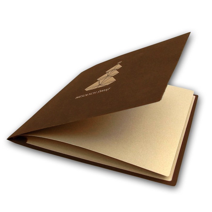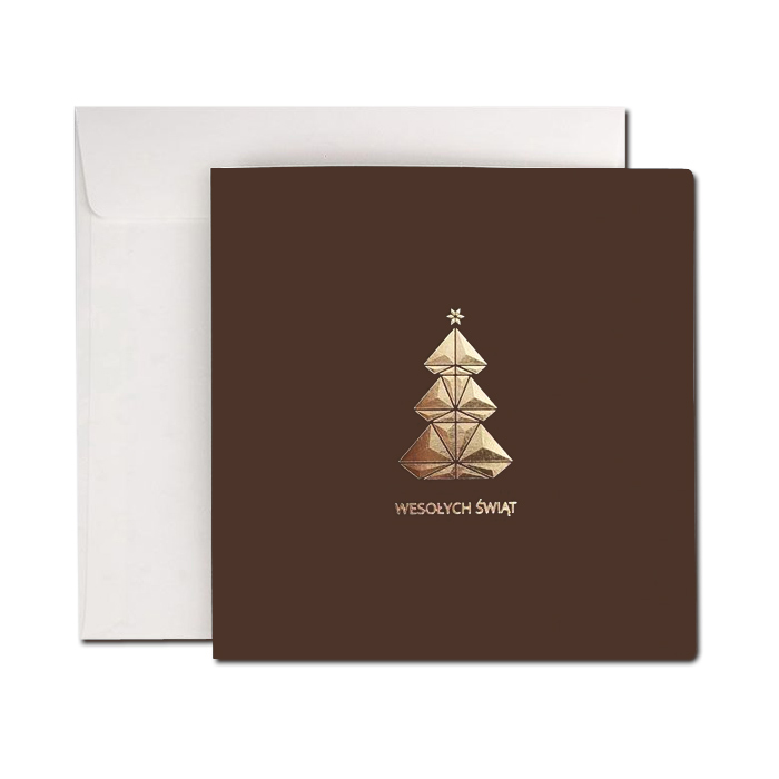 Minimalistyczna, a zarazem niezwykle elegancka kartka świąteczna wykonana z wysokiej jakości papieru matowego o miękkiej, gumowej strukturze w odcieniu ciepłego brązu. Na okładce dominuje tłoczony motyw choinki zbudowanej z geometrycznych form, pokrytej złotą folią, która efektownie odbija światło. Wkładka w kolorze starego złota harmonijnie dopełnia projekt, nadając mu luksusowego charakteru.